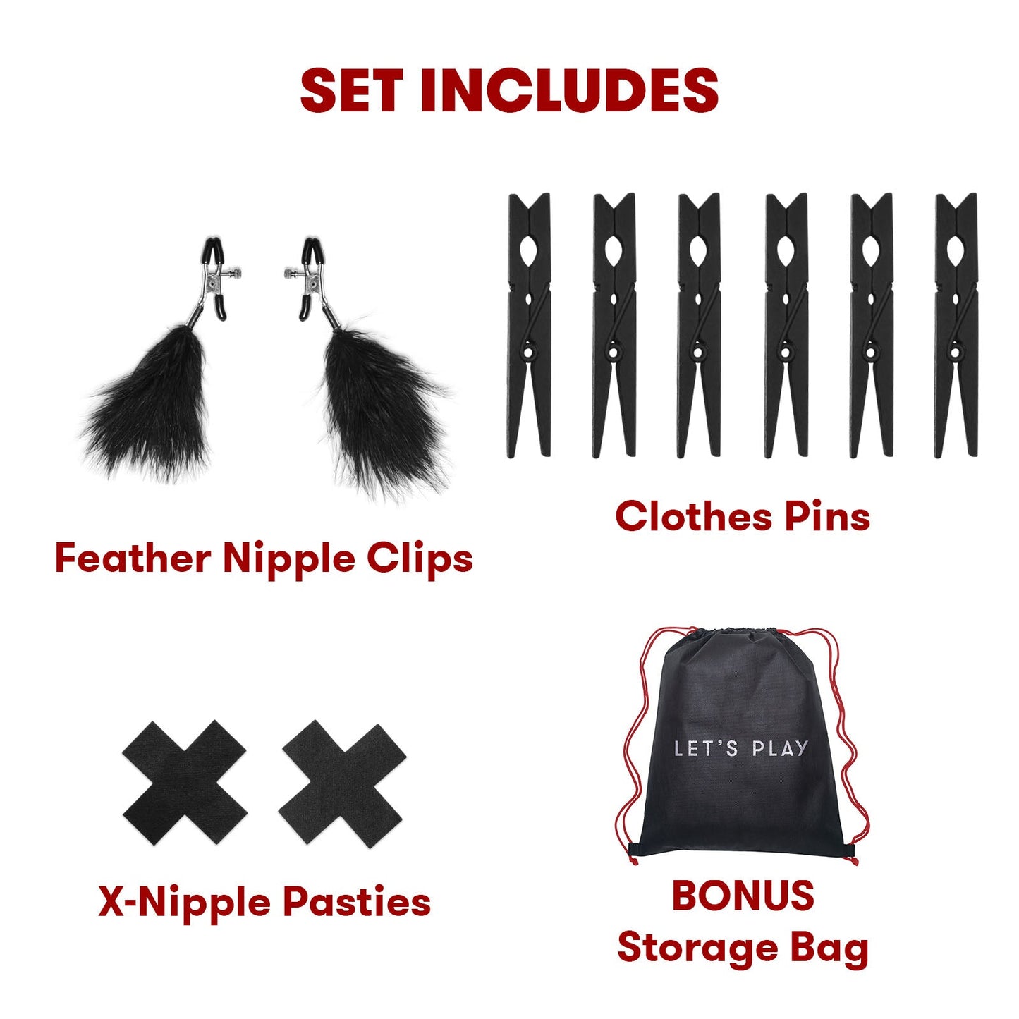 The Lux Fetish Sensory Experience With Wartenberg Pinwheel Bedspreaders - Bed Restraint 7PC Set is a sensual intro to the exciting world of sensory play. Lux Fetish’s bestselling bedspreader sets the stage for kinky stimulation by restraining your partner comfortably to your bed. Place the included satin blindfold over your partner’s eyes as you introduce the sensations provided by the included accessories in this set. Feel the tantalizing prick of the Wartenberg pinwheel, the sting of a low-temperature candle or feather nipple clips and clothespins. This set also includes stylish X-shaped nipple pasties that will have you looking the part of the sexiest submissive. The kinky possibilities are endless with this multi-piece set that’s perfect for a couple as well as group-play scenarios.