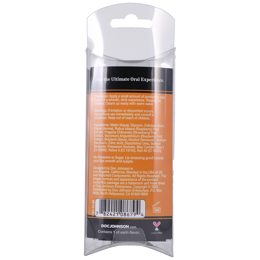 Just put your lips together and blow with Doc Johnson's 6 pack of GoodHead gel. Try for yourself and see how this edible oral-sex enhancer turns foreplay into an unforgettable experience. Includes single-use packets of of each flavor: Green Apple, Mint, Peach, Strawberry, Watermelon, and Passion Fruit.